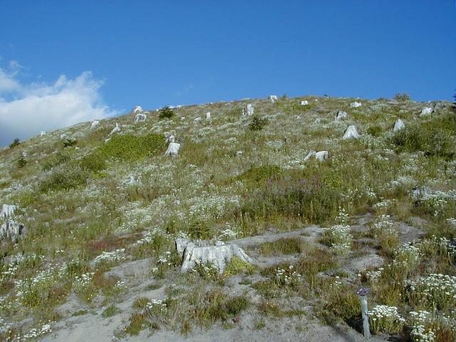 This stump atop Johnston Ridge was as tall as I am (about 6 feet). Twenty years of wear and tear have definitely begun to decompose a lot of the stumps in this area but I suspect they will be around for many decades to come.