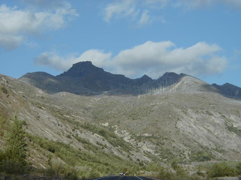 In this photo you can see a large stand of trees on the mountain top that are still standing though stripped of all their branches. They are so far away they look like match sticks. The white "dots" on the ground are actually stumps of other trees that were broken loose at ground level and carried along with the blast cloud that enveloped this area. Keep in mind that these are huge trees with trunks that are about four feet in diameter. Again, when viewing this area, scale is everything. Look at the bottom center of the photo to see a car that was coming toward me. One unusual aspect of nature's recovery within the monument is the fact that in some areas, pine trees and shrubs have come back during the intervening twenty years while in other areas such as this one, very little plant growth has occurred.