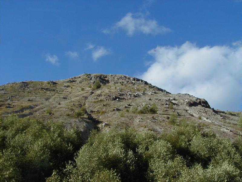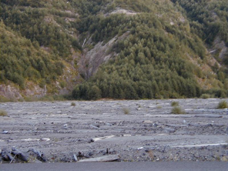 The picture below is a ground level view of the mudflow shown above. As you can see, it carried a lot of avalanche debris along with it such as trees, rock, etc.