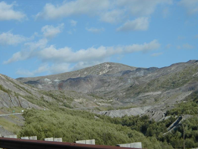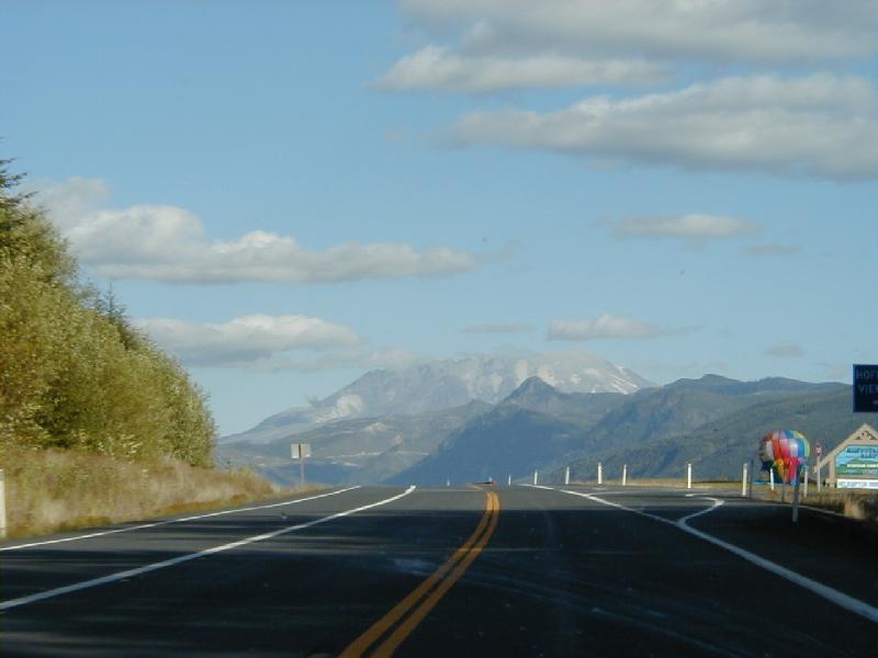 This was my first view of the north side of Mount St. Helens. That's it straight ahead at the end of the highway in the clouds which makes it a bit difficult to see in this photo. Here you can get at least some idea of just how large a mountain it is (and was). In this picture, I am about 17 miles away from the mountain (line of sight). If you were to view the mountain from the air, you would find that it is horseshoe shaped with the opening of the horseshoe facing to the north (that's to the left in this photo since I'm headed east).