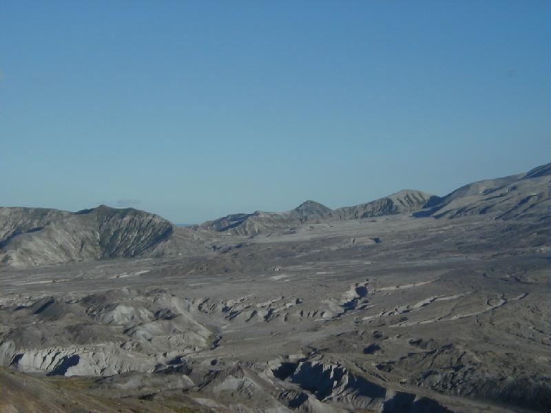 Another view of Harry's Ridge (photo below - the southern end). This area received a great deal of the avalanche and pyroclastic flow deposits hence the rounded hummocks. The grooves have been carved subsequent to the eruption in 1980 by the run-off of snow melt and other ground waters.