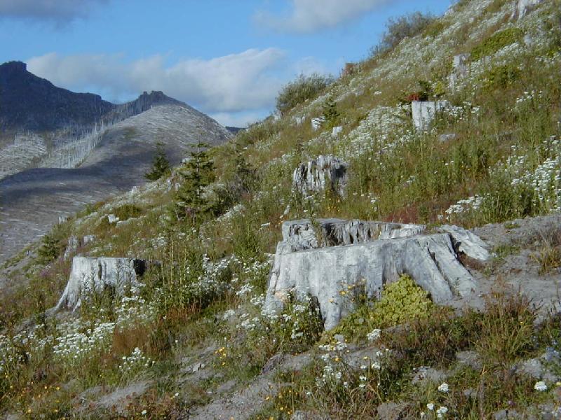 This stump atop Johnston Ridge was as tall as I am (about 6 feet). Twenty years of wear and tear have definitely begun to decompose a lot of the stumps in this area but I suspect they will be around for many decades to come.