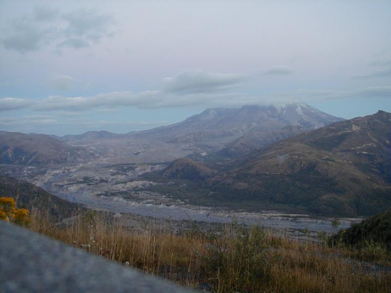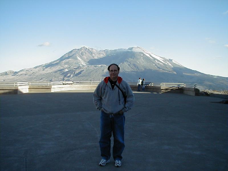 I didn't do it! OK, just kidding. Didn't want anyone to think I did this (the big hole in the ground behind me that is)! This was my first real view of the crater that is now Mount St. Helens. It is quite a contrast to the mountain that stood here prior to 1980. A friendly tourist asked me to take her picture and then thanked me by taking my picture. This is the viewing center atop Johnston Ridge. To the right of me in the photo is the viewing center. Unfortunately, it too was closed when I got there. If you go to the national monument, make sure you get there before 6:00 PM (Pacific time) so you can enjoy the visitor centers as well. I don't know if you can see it too very well in this photo but in the middle of the crater is a new lava dome. The dome grew in periodic episodes between 1980 and 1986. It is now approximately 1,000 feet tall and 3000 feet wide yet it looks so tiny inside the bulk of Mount St. Helens! The crater itself is 1 mile wide, a mile and one half long, and was originally 2000 feet deep (prior to the lava dome growing up in the middle of it). Some have estimated that in another 200 years, Mount St. Helens may be very close to its original height (assuming it does not experience another eruption similar to the one in 1980). The highest peak of the crater rim behind me is now at 8,365 feet in elevation. Try to visualize the mountain as it was pre May 18, 1980, with a typical peak at 9,677 feet! Imagine how much mass was displaced out of that cone!