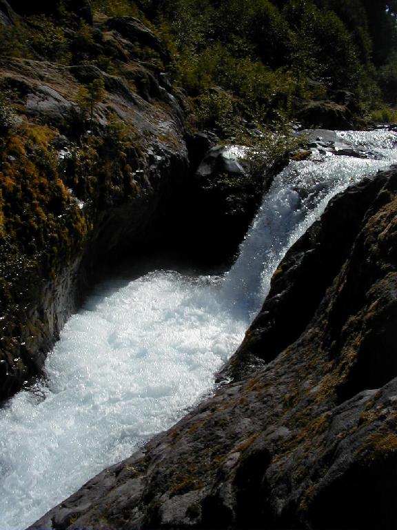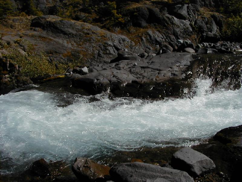 The river that runs through this canyon is composed entirely of run-off from the snow melt. As you can see, it produces lots of crystal clear water. I was tempted to remove the old socks and shoes and dangle my toes in the water just to see what it felt like until the shrill screams of a young girl who had just done the same thing convinced me that yes indeed, it's cold! This place contains many contrasts such as the jet black stone lava and the crystal clear white water.