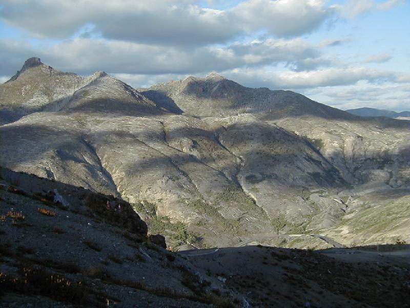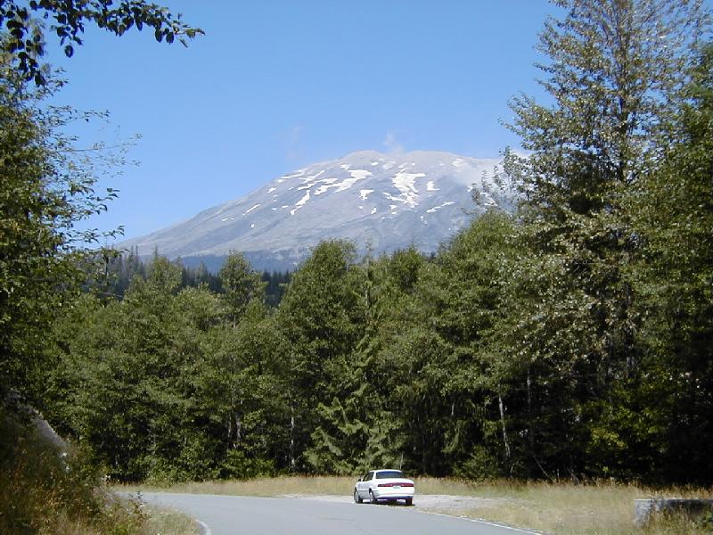In this photo you can see a large stand of trees on the mountain top that are still standing though stripped of all their branches. They are so far away they look like match sticks. The white "dots" on the ground are actually stumps of other trees that were broken loose at ground level and carried along with the blast cloud that enveloped this area. Keep in mind that these are huge trees with trunks that are about four feet in diameter. Again, when viewing this area, scale is everything. Look at the bottom center of the photo to see a car that was coming toward me. One unusual aspect of nature's recovery within the monument is the fact that in some areas, pine trees and shrubs have come back during the intervening twenty years while in other areas such as this one, very little plant growth has occurred.