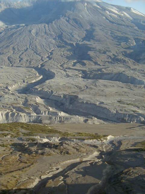 Another view of Harry's Ridge (photo below - the southern end). This area received a great deal of the avalanche and pyroclastic flow deposits hence the rounded hummocks. The grooves have been carved subsequent to the eruption in 1980 by the run-off of snow melt and other ground waters.