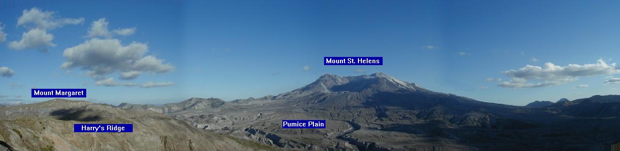 This photograph is actually a combination of 4 photos. I wanted to try to capture the breathtaking view which extends from Harry's Ridge past the eastern pumice plain to Mount St. Helens to the avalanche flow and pumice plain in the west. There is actually a sizable gap between Harry's Ridge and the next mountain chain east of that (with Mount Margaret farther off in the distant background) but it is hard to see in this photo. Down inside that gap is Spirit Lake; an area that was completely overrun by the avalanche coming from Mount St. Helens. A gentleman by the name of Harry Truman who was the innkeeper for Spirit Lake Lodge, a quaint lodge nestled at the south edge of Spirit Lake, was killed when the huge avalanche buried his entire resort and caused the lake to rise above its banks by 200-250 feet! Also, the lake became 1 mile longer after the assault by the avalanche! Waves as high as 850 feet arose from the lake during the impact by the avalanche. Thus, Harry's Ridge was named in honor of Mr. Truman. Keep in mind that in this picture, the opening in the top of Mount St. Helens is approximately a mile wide. Using that as a scale, you can tell that Harry's ridge is about 4-5 miles away. I am standing 5.5 miles away from Mount St. Helens. During my exit from the monument, I found that the "blow-down" area in which trees were flattened, extended for some 17 miles line of sight from Mount St. Helens! Unfortunately, Spirit Lake was well within the blast zone and suffered the ravages of avalanche debris, ash, countless tons of organic material (trees, grasses, shrubs, etc.) and had its temperature raised to almost 100F. It was supposed that very likely no life would have survived within the lake. However, just recently a member of the USGS (U.S. Geological Survey) dropped a line into the lake just to see if anything would nibble at his bait and to his surprise he caught a 24 inch rainbow trout! They were elated! Of course the lake has been off limits to fishermen ever since the eruption but the USGS was extremely pleased to see that life had not only made its way back into the monument (herds of elk and deer, birds, burrowing animals, etc.) but some life had obviously managed to survive an incredibly devastating disaster. Note: you may have to scroll to the right with your browser window in order to see this entire panorama.